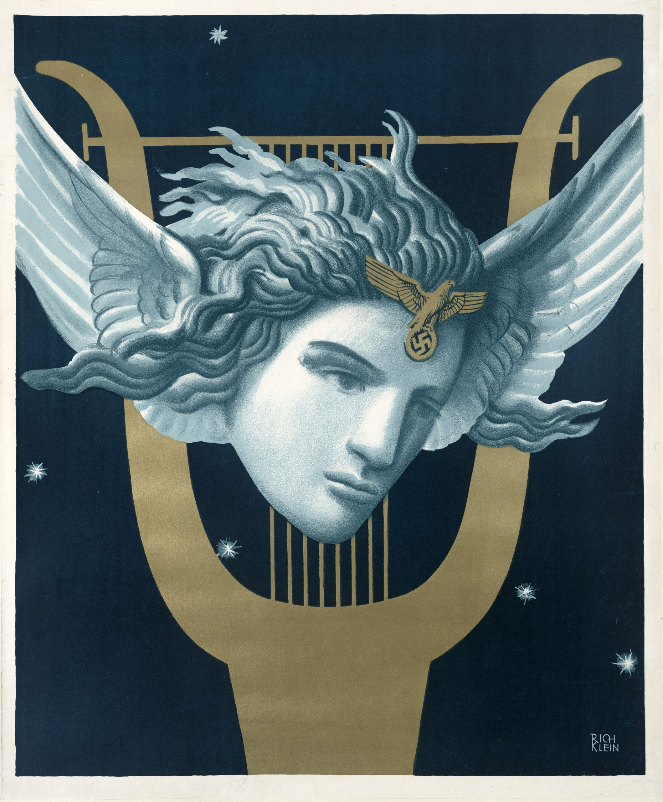 The head, reminiscent of a Greco-Roman statuary, and the lyre is reinforces the timeless, revered and noble past of music stretching back to antiquity. Meanwhile, the wings and the celestial background conveys its immaterial, elevated and cosmic nature. Finally, the eagle and the swastika emblazons the abstract concept of musical authority as a legitimate expression of the Aryan cultural and spiritual ideal.