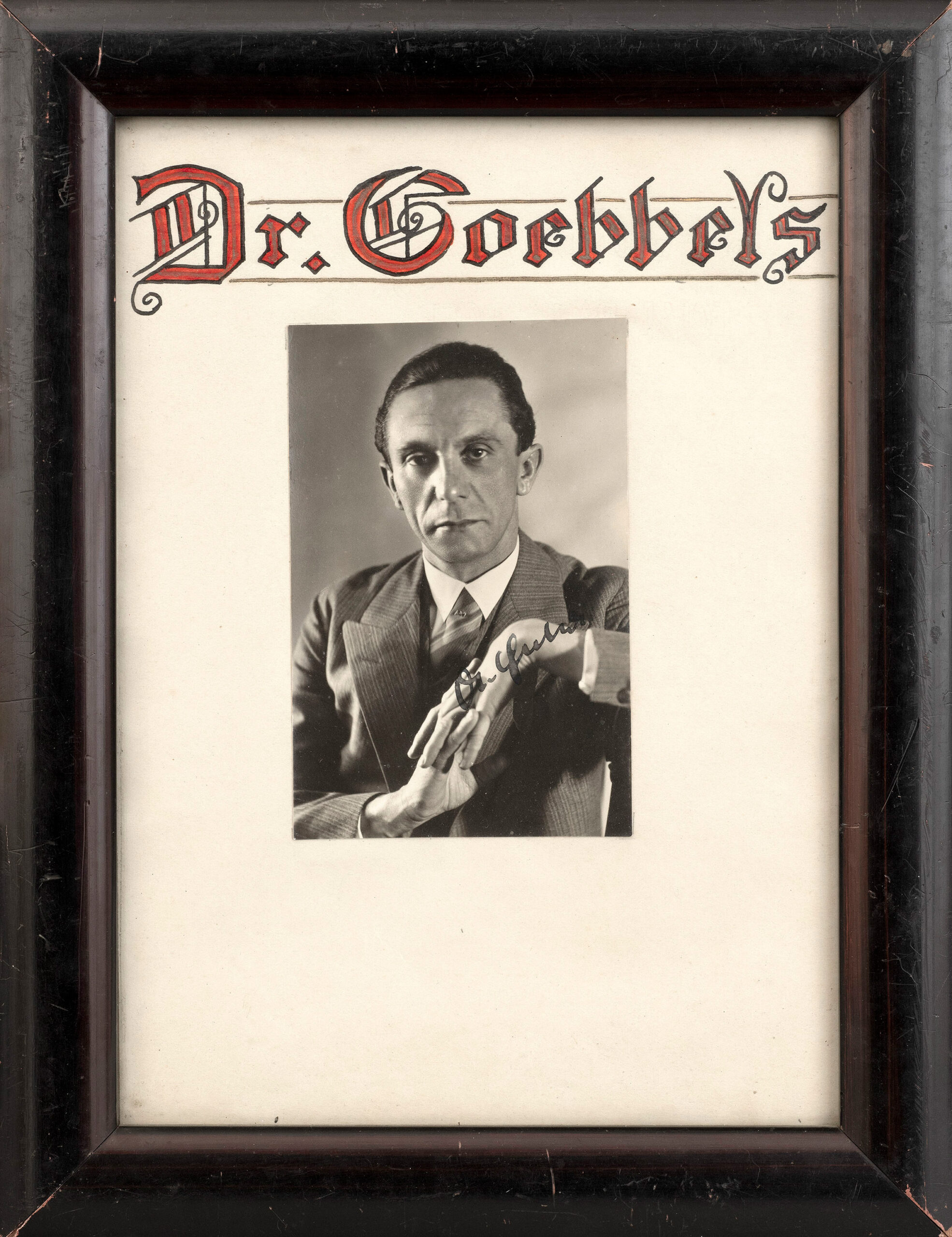 Framed and autographed portrait of Dr. Joseph Goebbels, Minister of Public Enlightenment and Propaganda. Amongst one of Hitler’s most loyal followers, Goebbels held great influence over cultural life within the Reich, heading multiple state organs pertaining to the arts. A fervent writer, Dr. Goebbels was known for his many poems and a diary which he kept for over 20 years from 1923 until his death in 1945. His loyalty to nation, talented prose and fanatical zeal are encapsulated by the following quote attributed to him: