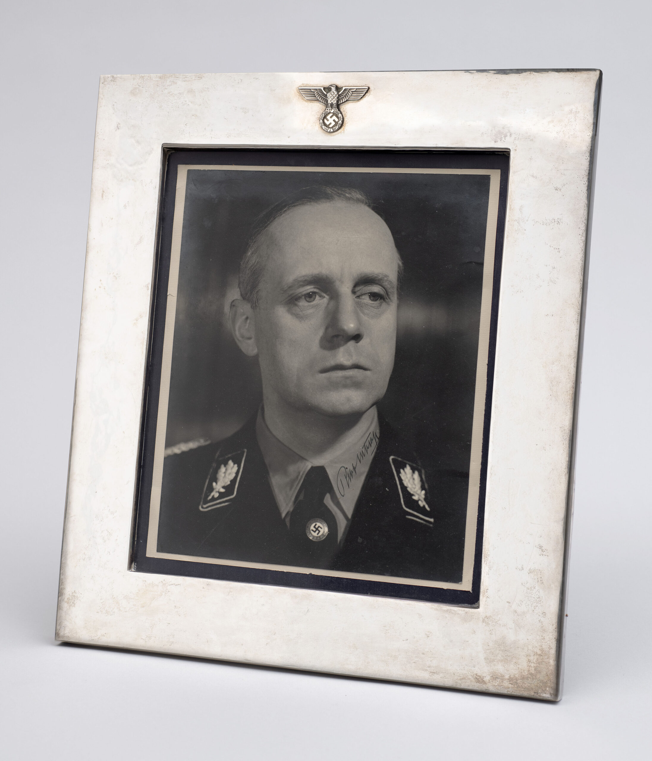 Large autographed portrait of German diplomat Joachim von Ribbentrop, encased in a dedicated silver frame adorned by a Reichsadler. Ribbentrop was a high-ranking German official who served as the Minister of Foreign Affairs of Nazi Germany from 1938 to 1945. He is credited for several significant diplomatic breakthroughs that shaped the course of the Second World War, including the formation of the Pact of Steel with Italy, Tripartite Pact with Japan and the eponymous Molotov-Ribbentrop Pact with the Soviet Union.