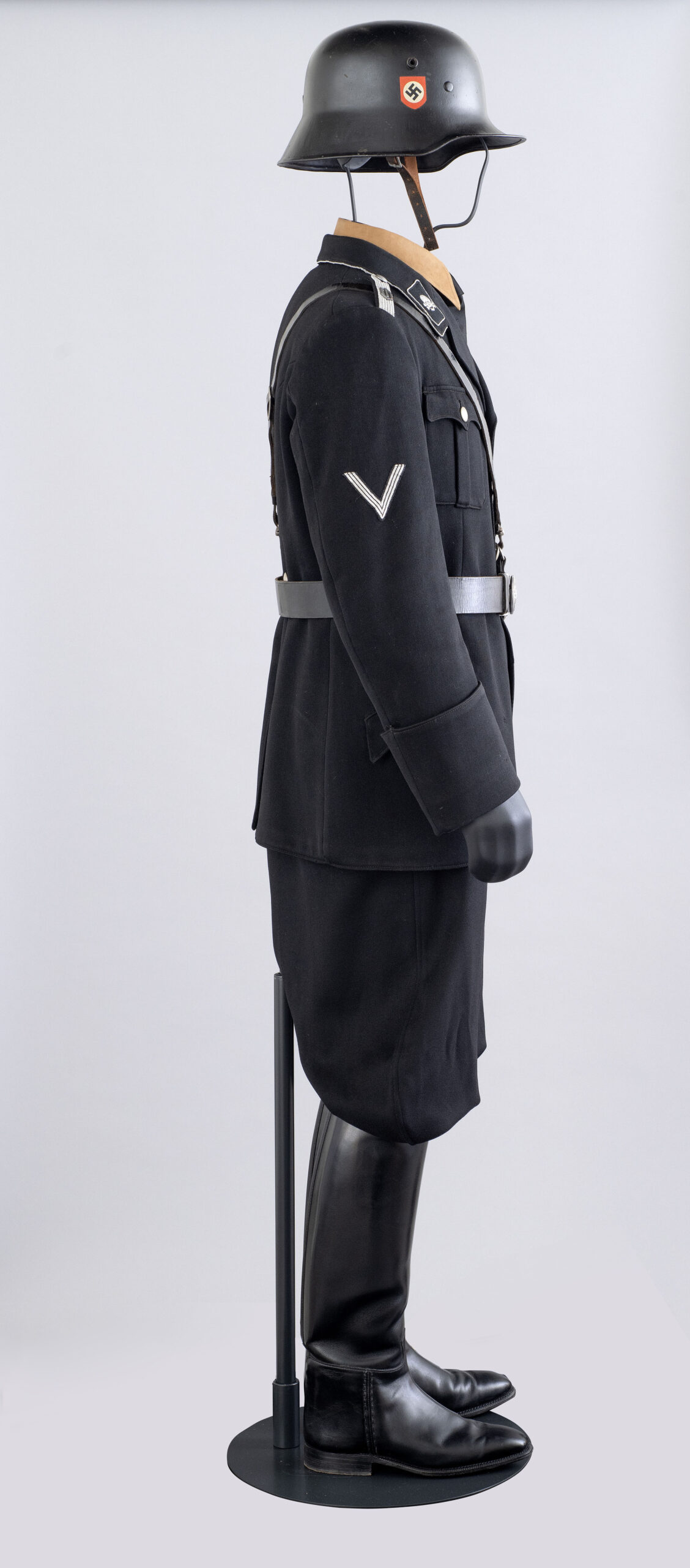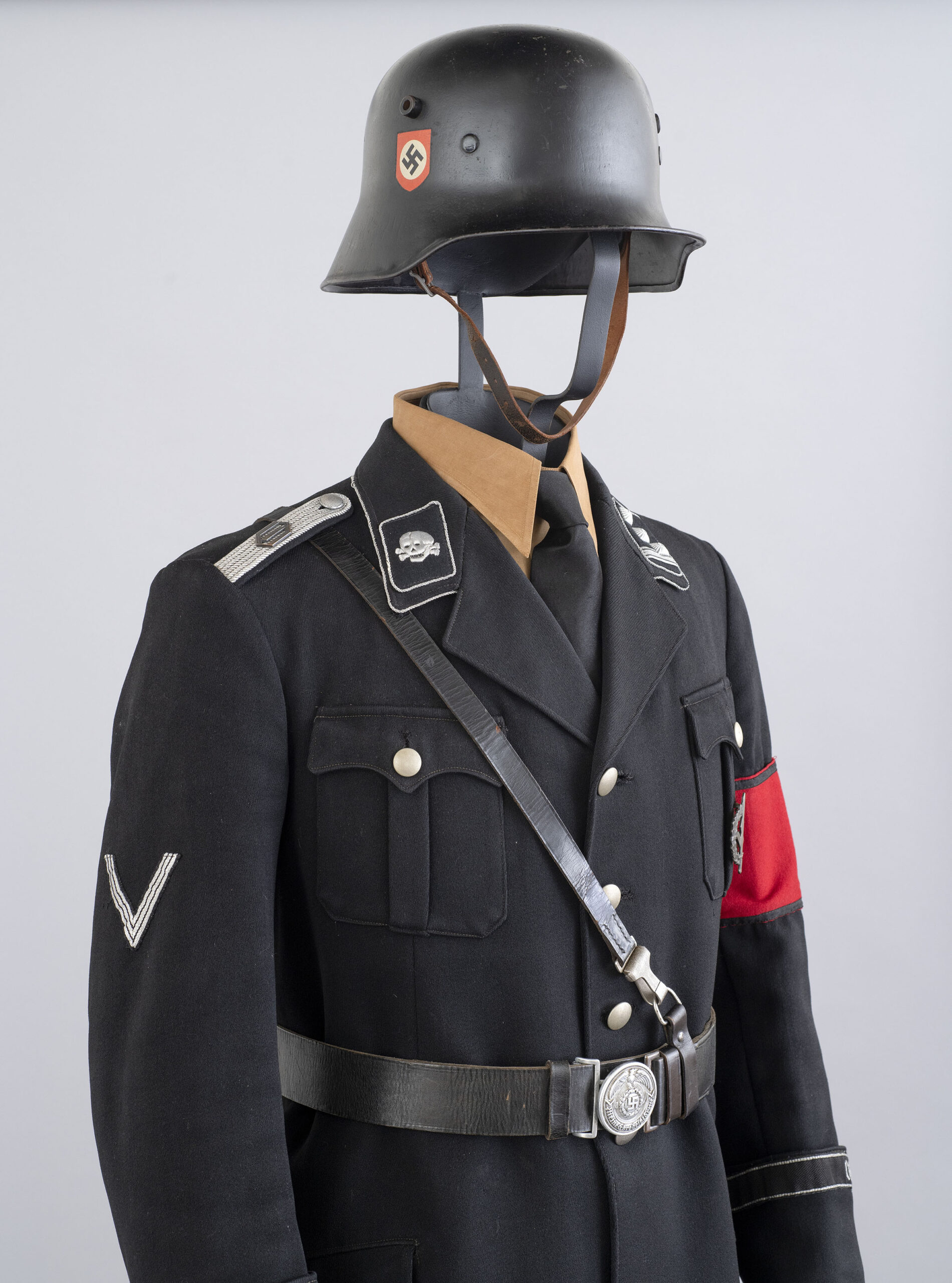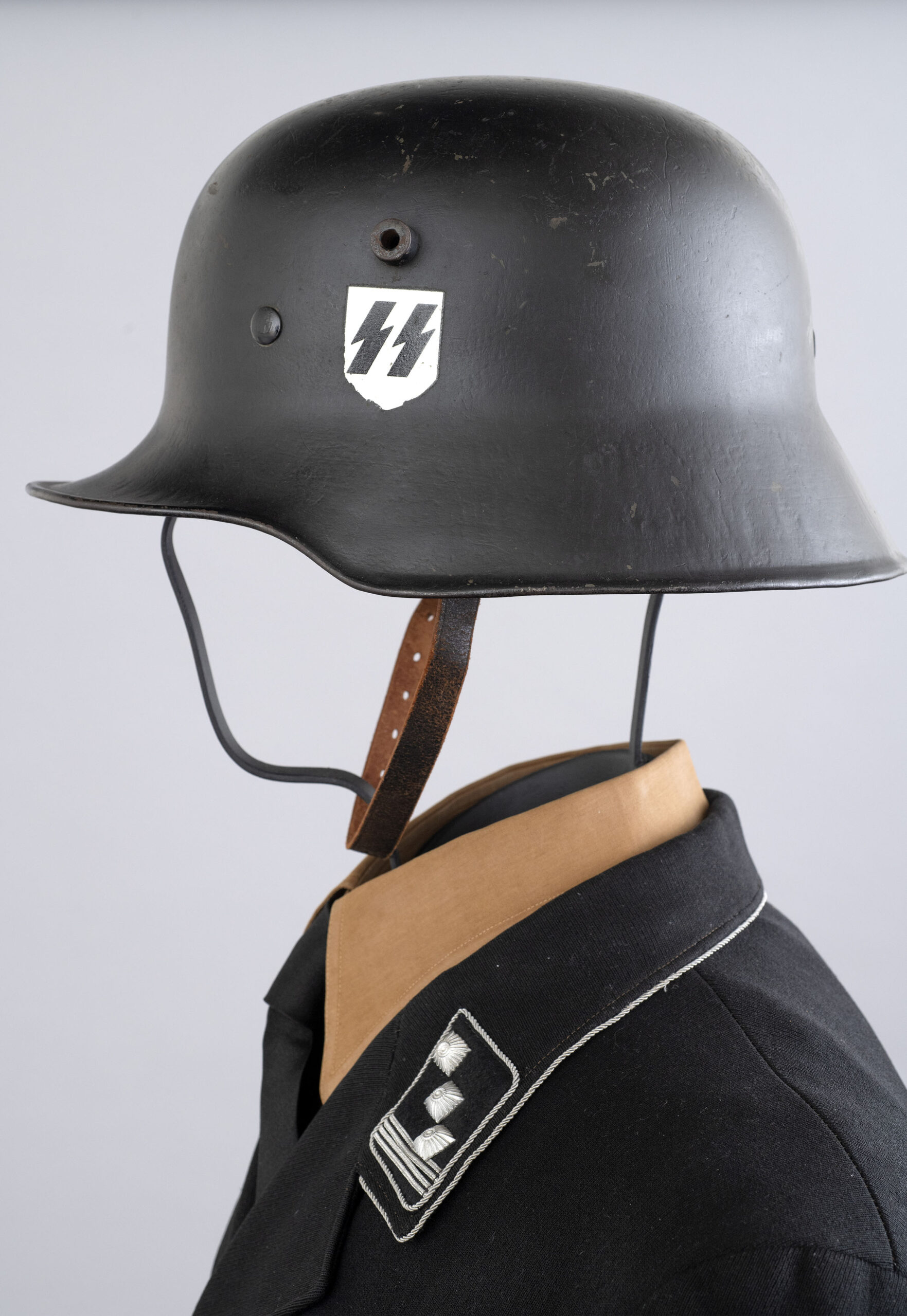 Interestingly, this SS-Hauptsturmführer tunic also boasts an honor chevron (Ehrenwinkel der Alten Kämpfer) on its left sleeve, signifying the wearer as an Alten Kämpfer (Old Fighter), a title bestowed to early members of the Nazi Party who had joined prior to their ascent to power in 1933. The uniform is paired with a double decal M18 helmet, an earlier model of the stahlhelm which was commonly employed by Nazi Germany’s internal security forces (such as the SS-TV), being surplus equipment from the First World War. The original owner of this uniform was undoubtably a deeply loyal apostle of the National Socialist cause, being an early proponent of the Nazi Party to also oversee its burgeoning concentration camp system, likely having had a direct influence on the Reich’s later genocidal machinations.