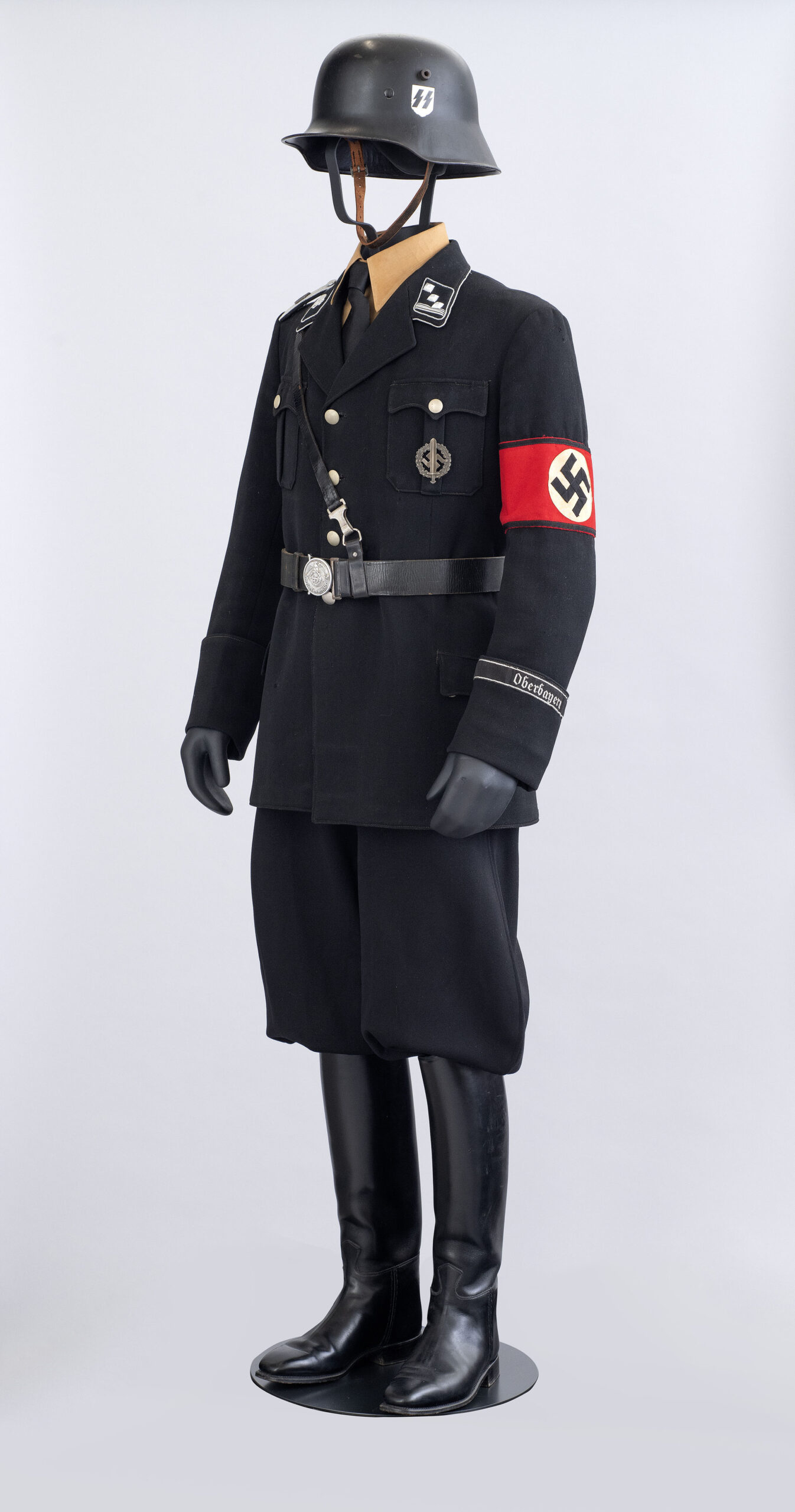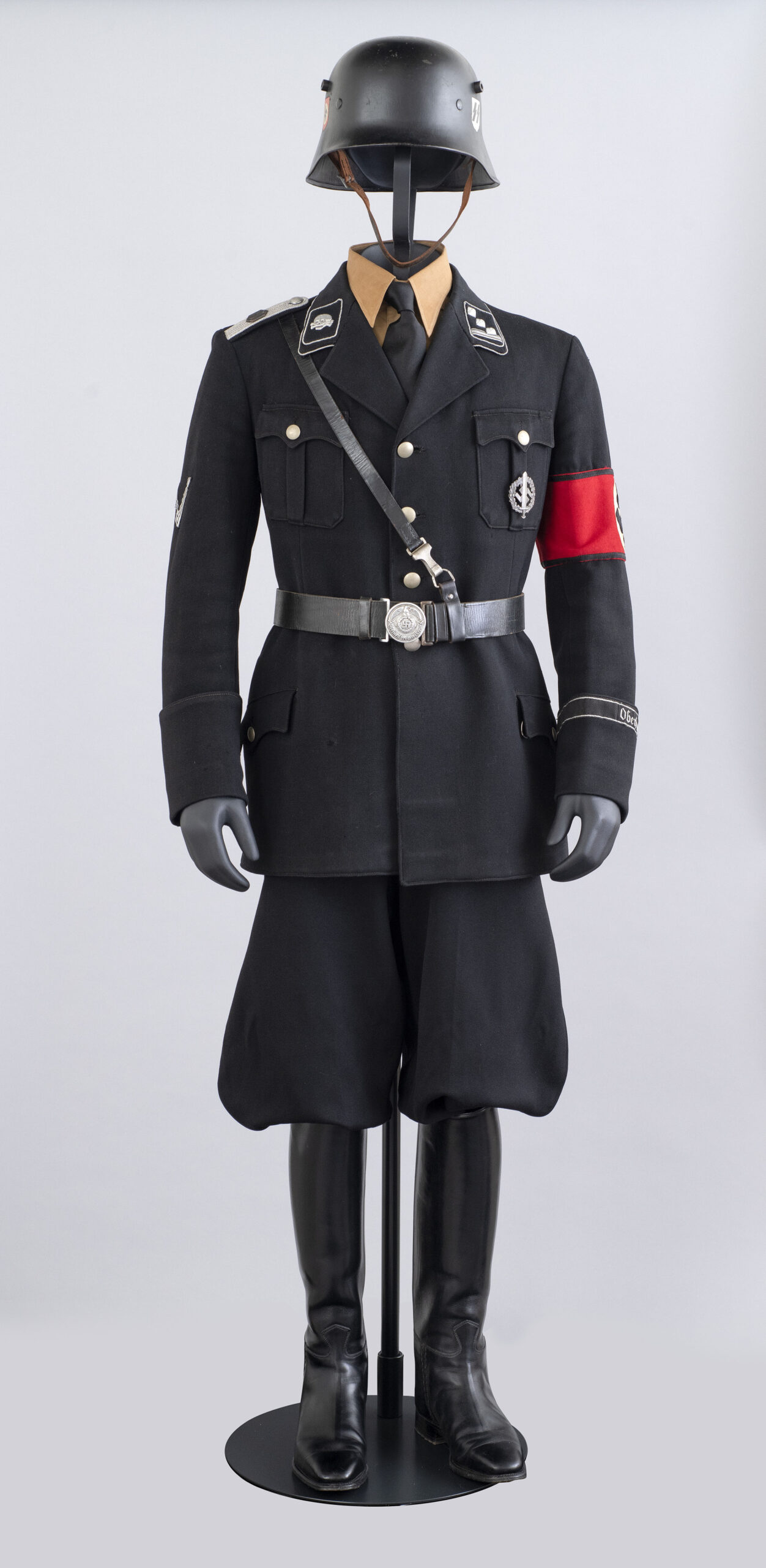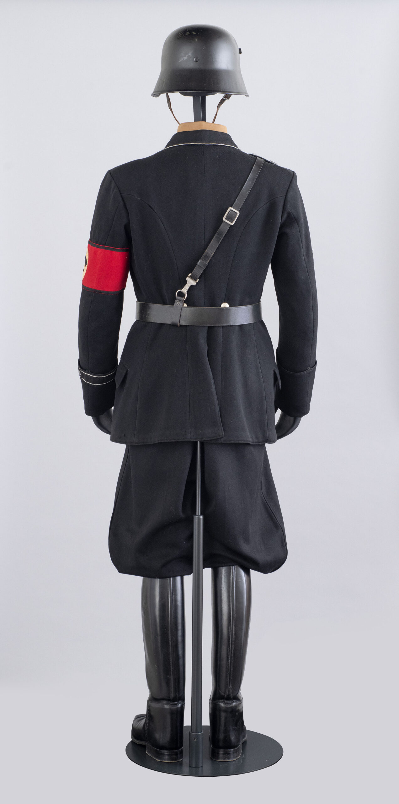 Interestingly, this SS-Hauptsturmführer tunic also boasts an honor chevron (Ehrenwinkel der Alten Kämpfer) on its left sleeve, signifying the wearer as an Alten Kämpfer (Old Fighter), a title bestowed to early members of the Nazi Party who had joined prior to their ascent to power in 1933. The uniform is paired with a double decal M18 helmet, an earlier model of the stahlhelm which was commonly employed by Nazi Germany’s internal security forces (such as the SS-TV), being surplus equipment from the First World War. The original owner of this uniform was undoubtably a deeply loyal apostle of the National Socialist cause, being an early proponent of the Nazi Party to also oversee its burgeoning concentration camp system, likely having had a direct influence on the Reich’s later genocidal machinations.
